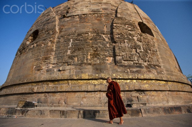 03 Mar 2011, Varanasi, India — Buddhist monk praying as he walks around Dhamakh Stupa at Sarnath ruins near Varanasi, Benares, Northern India — Image by © Tim Graham/Corbis