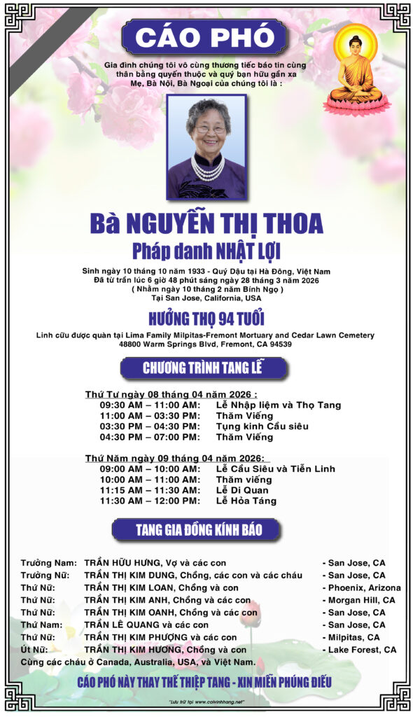 Sign in Welcome! Log into your account your username your password Forgot your password? Get help Password recovery Recover your password your email A password will be e-mailed to you. CÁO PHÓ - PHÂN ƯU - CẢM TẠTÀI LIỆU NHÂN THÂN Cáo phó Nguyễn Thị Thoa April 1, 2026 0 63 Họ và tên:Nguyễn Thị Thoa Pháp danh:Nhật lợi Nguyên quán:Hà Đông, Việt Nam Ngày năm sinh:10 tháng 10 năm 1933 Ngày mất:28 tháng 3 năm 2026 Hưởng đại thọ:94 tuổi Share FacebookTwitterPinterestWhatsApp Previous articleGĐ Nguyễn Văn Thinh, GĐ Đỗ Hữu Hạnh phân ưu cùng GĐ Nguyễn Cao CanNext articleCáo phó Nguyễn Quang Thành LEAVE A REPLY Cancel replyLog in to leave a comment Cùng danh mục CÁO PHÓ - PHÂN ƯU - CẢM TẠ Cáo phó Nguyễn Quang Thành April 1, 2026 0 CÁO PHÓ - PHÂN ƯU - CẢM TẠ GĐ Nguyễn Văn Thinh, GĐ Đỗ Hữu Hạnh phân ưu cùng GĐ Nguyễn Cao Can March 20, 2026 0 CÁO PHÓ - PHÂN ƯU - CẢM TẠ Hội ái hữu Quốc học Đồng Khánh Bắc CA phân ưu cùng GĐ Tạ Thị Thu Cúc March 20, 2026 0 CÁO PHÓ - PHÂN ƯU - CẢM TẠ Cảm tạ của GĐ Ngô Ngọc Khanh March 20, 2026 0 CÁO PHÓ - PHÂN ƯU - CẢM TẠ Cựu nữ sinh Lê Văn Duyệt Gia Định 1972 Bắc CA phân ưu cùng GĐ Nguyễn THị THu March 13, 2026 0 CÁO PHÓ - PHÂN ƯU - CẢM TẠ Cáo phó Lê Tuyết Mai March 13, 2026 0 CÁO PHÓ - PHÂN ƯU - CẢM TẠ Cáo phó Lâm Văn Sang March 6, 2026 0 CÁO PHÓ - PHÂN ƯU - CẢM TẠ Cáo phó Nguyễn Cao Can March 6, 2026 0 CÁO PHÓ - PHÂN ƯU - CẢM TẠ Đại diện cựu sinh viên OHIO UNIVERSITY và thân hữu phân ưu cùng GĐ Trần Thanh Nhiên March 6, 2026 0 CÁO PHÓ - PHÂN ƯU - CẢM TẠ Cáo phó Trần Thanh Nhiên March 6, 2026 0