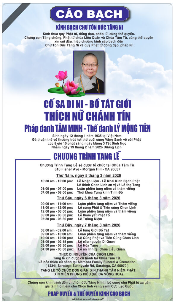 Sign in Welcome! Log into your account your username your password Forgot your password? Get help Password recovery Recover your password your email A password will be e-mailed to you. CÁO PHÓ - PHÂN ƯU - CẢM TẠTÀI LIỆU NHÂN THÂN Cáo phó Thích Nữ Chánh Tín February 25, 2026 0 17 Họ và tên:Cố Sa Di Ni - Bồ Tát Giới Thích Nữ Chánh Tín Nhủ danh:Lý Mộng TIênn Pháp danh:Tâm Minh Nguyên quán:Việt Nam Ngày năm sinh:12 tháng 1 năm 1935 Ngày mất:19 tháng 2 năm 2026 Share FacebookTwitterPinterestWhatsApp Previous articleGĐ thông gia Nguyễn Châu phân ưu cùng GĐ Phạm Quang TuyếnNext articleCáo phó Ngô Ngọc Khanh LEAVE A REPLY Cancel replyLog in to leave a comment Cùng danh mục CÁO PHÓ - PHÂN ƯU - CẢM TẠ Cáo phó Tạ Thị THu Cúc February 25, 2026 0 CÁO PHÓ - PHÂN ƯU - CẢM TẠ Cáo phó Ngô Ngọc Khanh February 25, 2026 0 CÁO PHÓ - PHÂN ƯU - CẢM TẠ GĐ thông gia Nguyễn Châu phân ưu cùng GĐ Phạm Quang Tuyến February 6, 2026 0 CÁO PHÓ - PHÂN ƯU - CẢM TẠ Đồng môn ĐH Sư Phạm Huế 1975 phân ưu cùng GĐ Đoàn Khoách February 6, 2026 0 CÁO PHÓ - PHÂN ƯU - CẢM TẠ Cảm tạ của GĐ Trần Thị Nữ February 6, 2026 0 CÁO PHÓ - PHÂN ƯU - CẢM TẠ Cáo phó Nguyễn Văn Đình February 6, 2026 0 CÁO PHÓ - PHÂN ƯU - CẢM TẠ Cựu HS Trưng Vương 58-65 phân ưu cùng GĐ Lisa Trần January 30, 2026 0 CÁO PHÓ - PHÂN ƯU - CẢM TẠ GĐ Đại học Huế Hải ngoại phân ưu cùng GĐ Đoàn Khoách January 30, 2026 0 CÁO PHÓ - PHÂN ƯU - CẢM TẠ Cáo phó Lê Hiền Sĩ January 30, 2026 0 CÁO PHÓ - PHÂN ƯU - CẢM TẠ Bạn bè chiến hữu gần xa phân ưu cùng GĐ Trần Quang Nở January 28, 2026 0