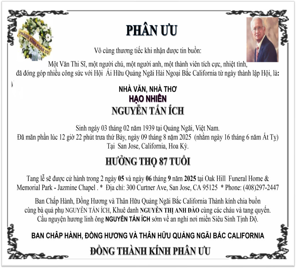 Đồng Hương Thân Hữu Quảng Ngãi phân ưu cùng GĐ Nguyễn Tấn Ích