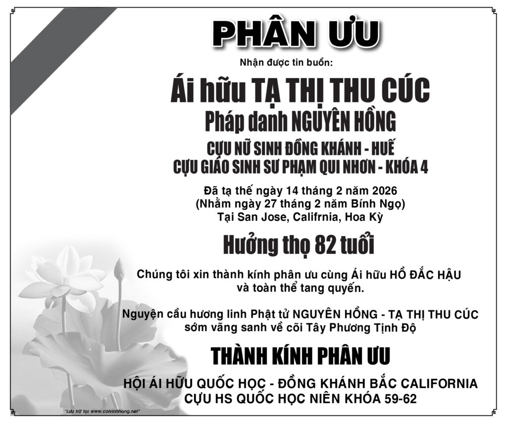 Hội ái hữu Quốc học Đồng Khánh Bắc CA phân ưu cùng GĐ Tạ Thị Thu Cúc