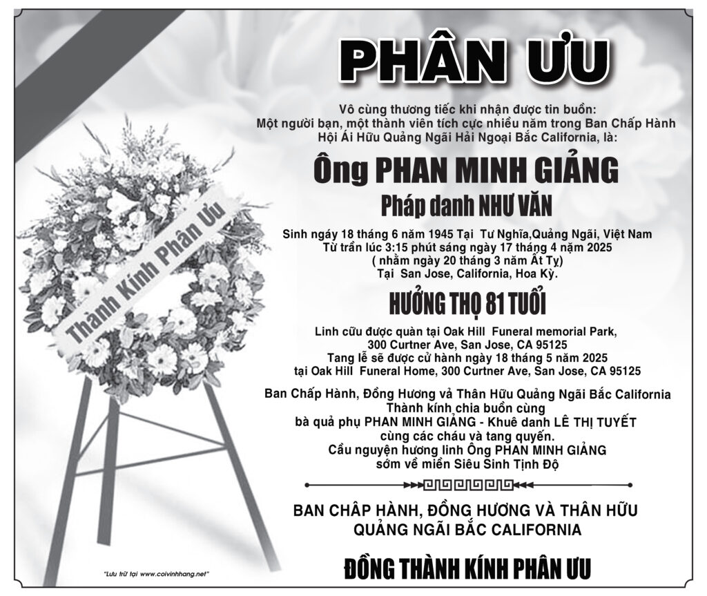 Hội Đồng Hương & Thân hữu Quảng Ngãi phân ưu cùng GĐ Phan Minh Giảng