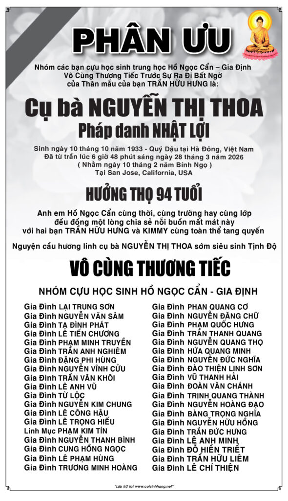 Nhóm cựu học sinh Hồ Ngọc Cẩn – Gia Định phân ưu cùng GĐ Nguyễn Thị Thoa